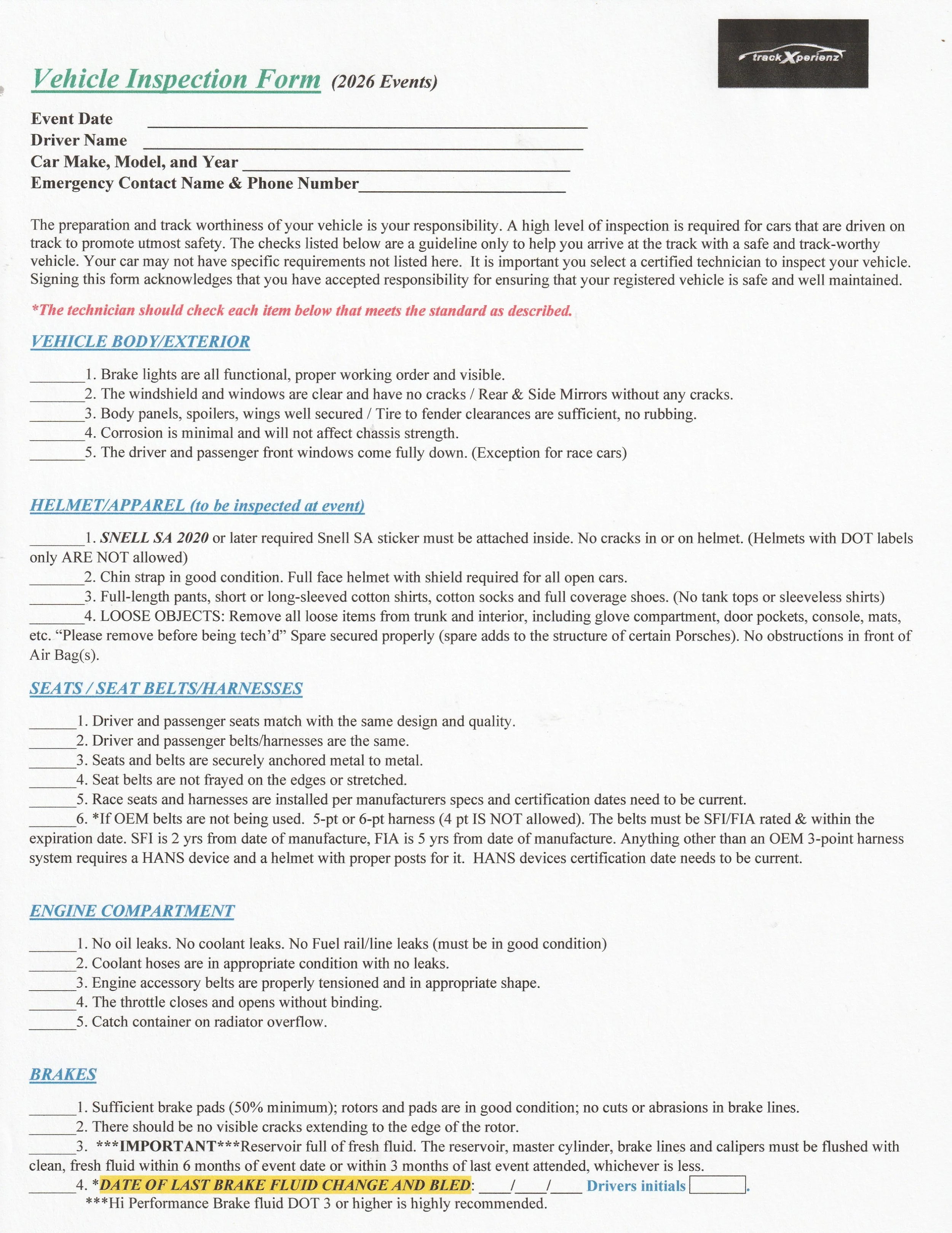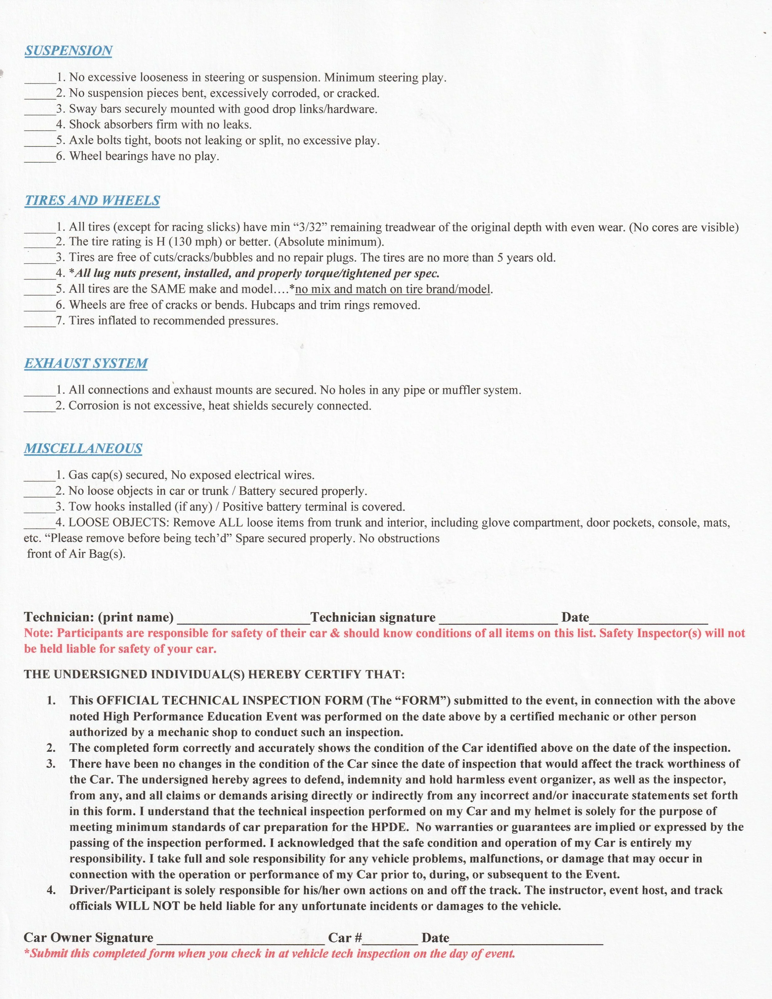 Please have your vehicle(s) inspected by a certified mechanic/shop WITHIN two weeks of the registered event and complete these two pages.